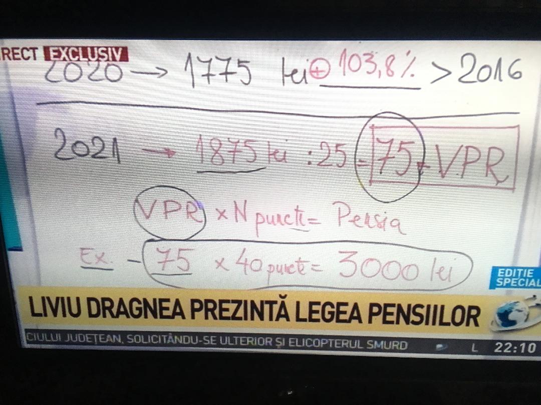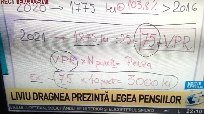 „Dacă în 2016, anul guvernării lui Cioloș, punctul de pensii era de 871 de lei, în 2021, datorită creșterii veniturilor publice, cu aproape 117 miliarde de lei în 2020, punctul de pensie va fi de 1875 de lei„, a explicat Liviu Dragnea la tabla din platoul de la ”Sinteza zilei” ”Practic, se va dubla punctul de pensie.”