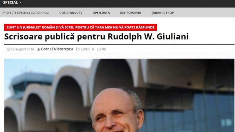 Cornel Nistorescu, directorul ziarul Cotidianul, îi transmite lui Rudolph Giuliani, avocatul lui Donald Trump, o scrisoare deschisă, în care vorbește despre statul paralel și modul în care „cîțiva politicieni și ofițeri de servicii secrete” au creat mașinărie care afectează nu doar justiția, scrie Mediafax.