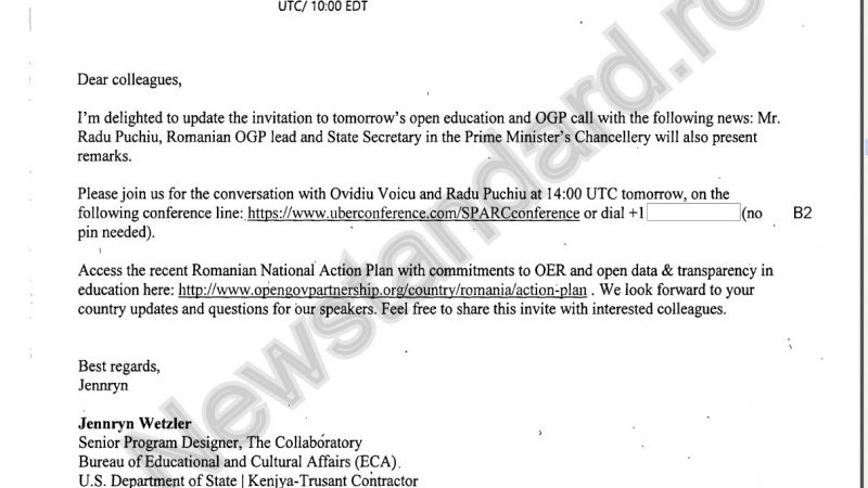 La 16 septembrie 2016, Jennryn Wetzler, de la Biroul de Afaceri Educaționale și Culte al Departamentului de Stat, a trimis un e-mail prin care anunța publicul participant la o conferinţă „Open Government Partnership” că vorbitorul, Ovidiu Voicu, este sponsorizat de Departamentul de Stat. Voicu este directorul executiv al Centrului pentru Inovare Publică, care se descrie ca un amplificator (dezvoltator) al programelor Fundației Soros pentru o Societate Deschisă.