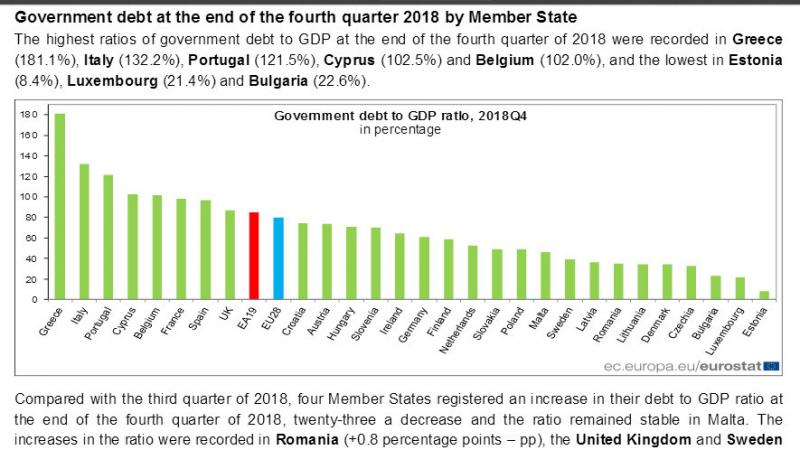 Pe primul loc se află Grecia cu 181%, urmată de Italia cu 132%, Portugalia cu 121,5%, Cipru cu 102,5%, Belgia cu 102%. România se află pe locul 21 din 28 de state.